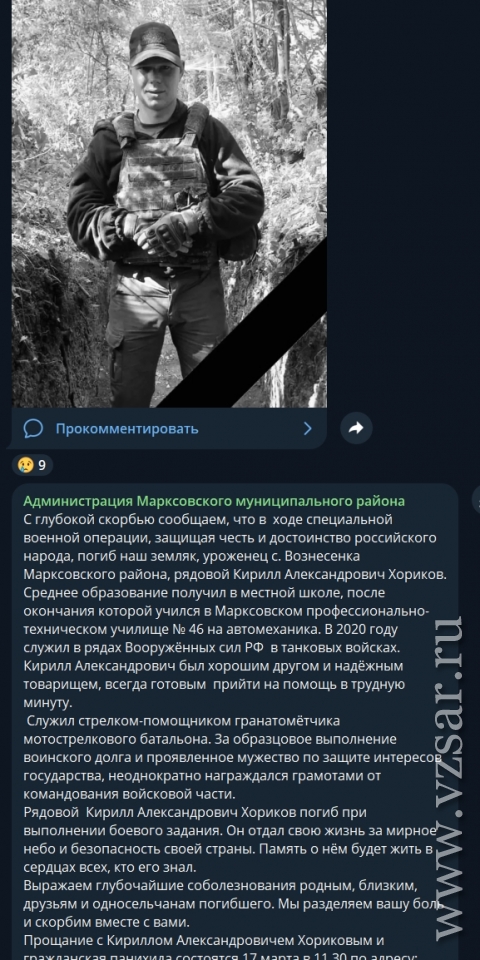 Администрация Марксовского района рассказала, что завтра в селе Вознесенка простятся с Кириллом Хориковым.