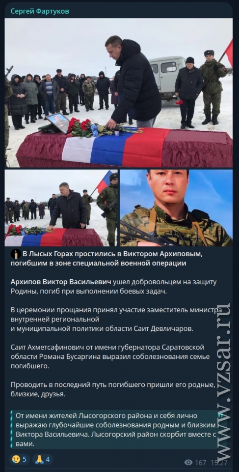 Глава Лысогорского района Сергей Фартуков рассказал о прошедшем в райцентре прощании с погибшим добровольцем Виктором Архиповым.