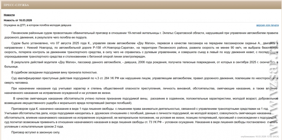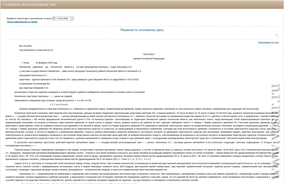 Смертельная дорожная авария произошла 7 августа прошлого года, когда подсудимая (согласно данным картотеке суда, это была ранее не судимая Анастасия Конопелько) на автомобиле "Дэу Матиз" ехала по дороге Р-158 (Нижний Новгород – Саратов) по территории Пензенского района. С ней на переднем пассажирском сиденье находилась ее подруга-ровесница.