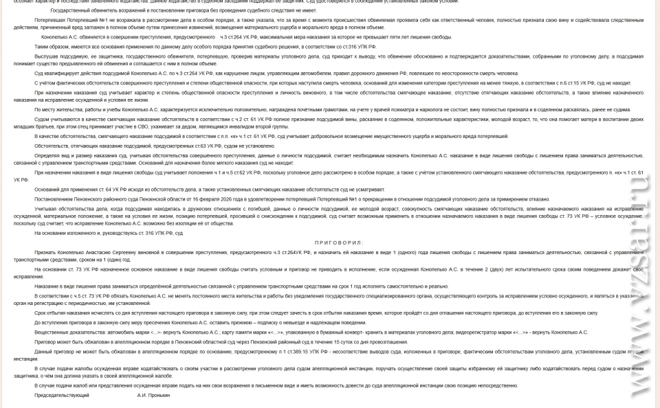 Действия молодой автоледи были квалифицированы по ч. 3 ст. 264 УК РФ (нарушение лицом, управляющим автомобилем, Правил дорожного движения, повлекшее по неосторожности смерть человека). На процессе подсудимая вину признала полностью.