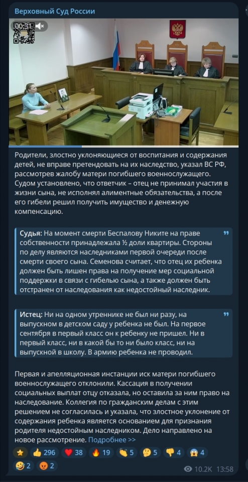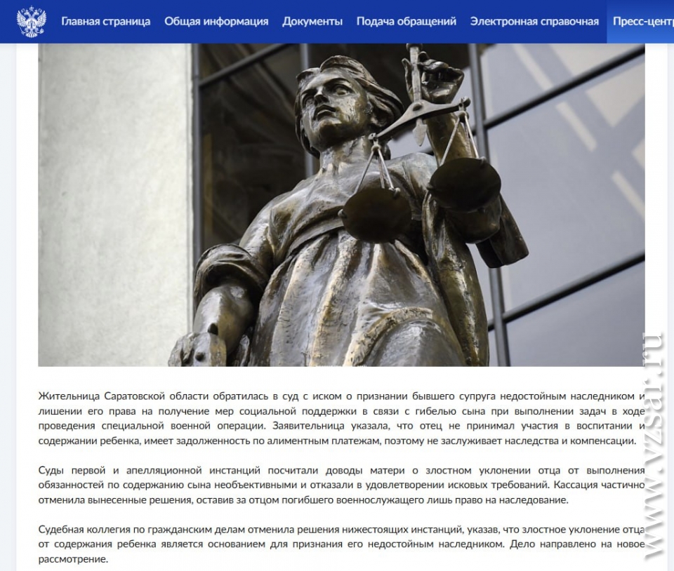 Жительница Саратовской области обратилась в суд с иском о признании бывшего супруга недостойным наследником и лишении его права на получение мер социальной поддержки в связи с гибелью их сына Никиты Беспалова в ходе проведения СВО.