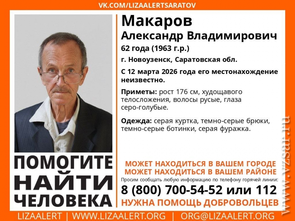 Кроме того, в Новоузенске ищут 62-летнего Александра Макарова, пропавшего 12 марта.