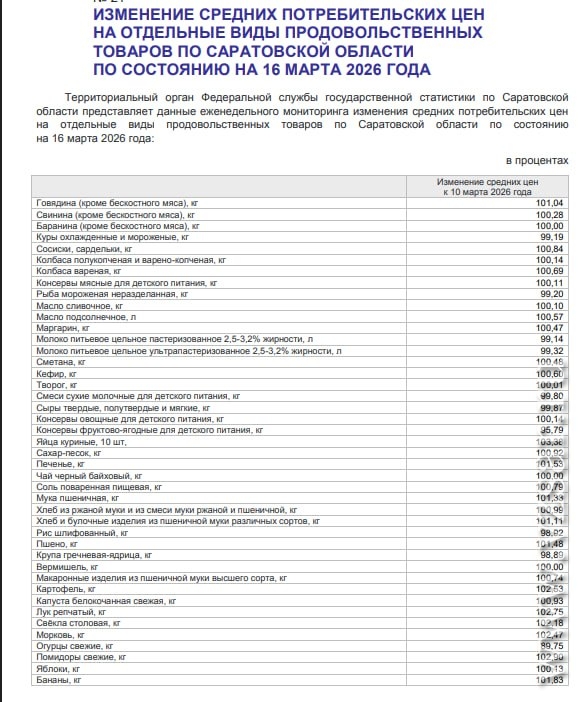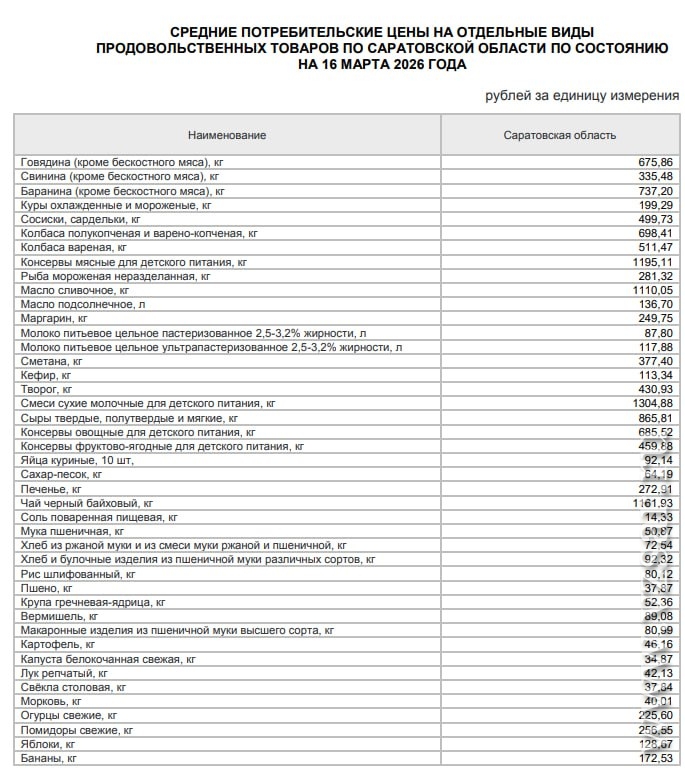 На 16 марта средняя цена сахара-песка в регионе составляла 64,19 руб./кг, муки – 50,87 руб./кг, десятка яиц – 92,14 руб., масла подсолнечного – 136,7 руб./л, масла сливочного – 1110,05 руб./кг, сметаны – 377,4 руб./кг, кур охлажденных и мороженых – 199,29 руб./кг, капусты – 34,87 руб./кг, свеклы – 37,84 руб./кг, лука – 42,13 руб./кг, картофеля – 46,16 руб./кг, макарон – 80,99 руб./кг, огурцов – 225,6 руб./кг, помидоров – 256,55 руб./кг, бананов – 172,53 руб./кг.