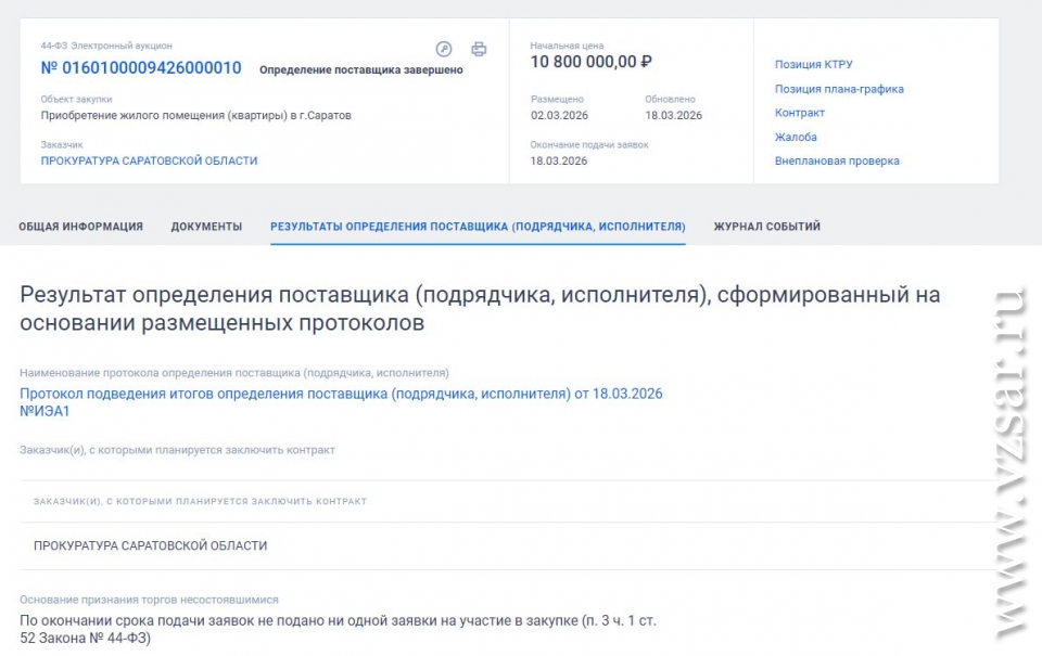 Прокуратура Саратовской области (возглавляет Сергей Филипенко) подвела итоги аукциона на покупку квартиры.