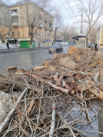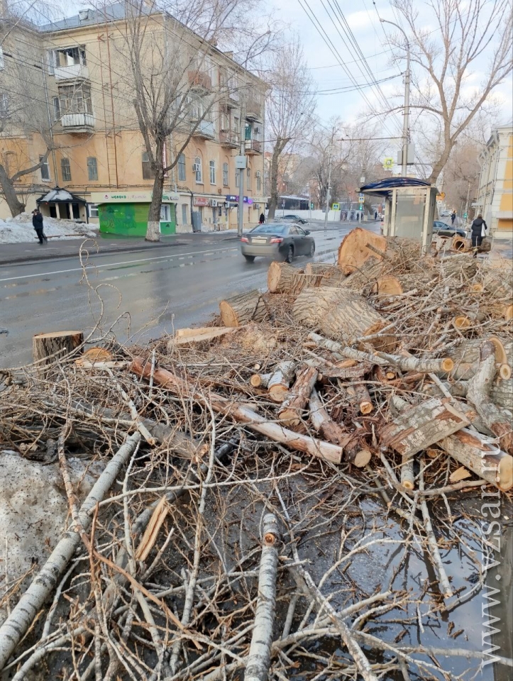 Она прислала также в редакцию фотографии, на которых видны спилы живых деревьев, а также горы веток и стволов, сложенных, в том числе, возле одной из остановок общественного транспорта.