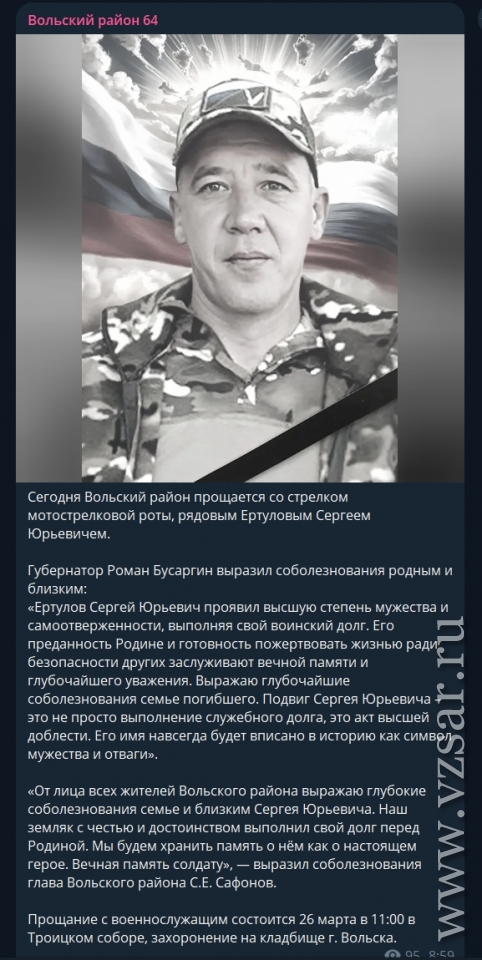 В Вольске земляки простились со стрелком мотострелковой роты Сергеем Ертуловым, рассказали в райадминистрации.