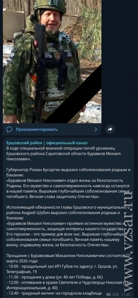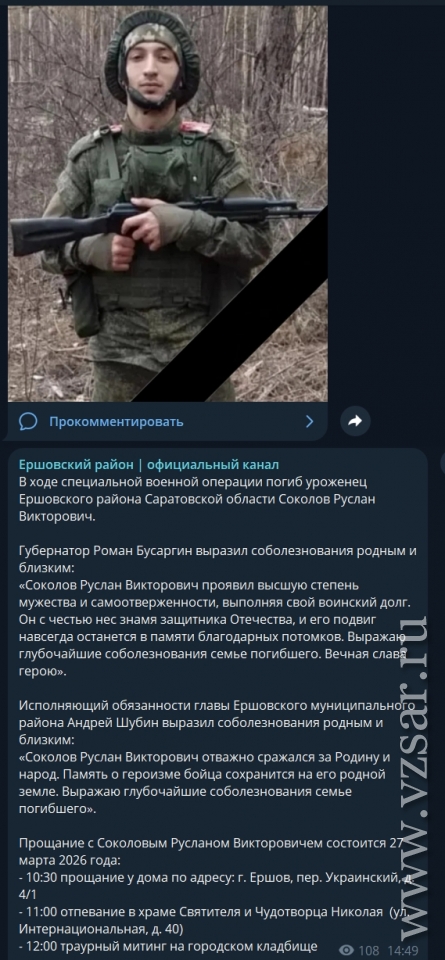 Завтра в Ершове пройдет церемония прощания с погибшими на спецоперации Русланом Соколовым и Михаилом Буравковым.