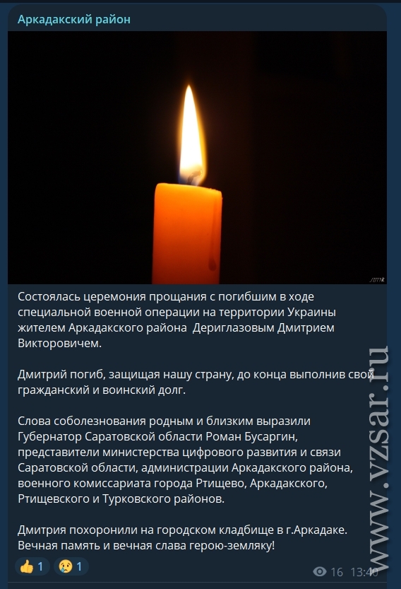 А в Аркадаке проводили в последний путь Дмитрия Дериглазова, сообщили местные власти.