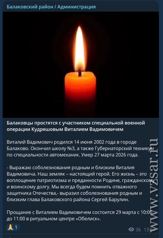 Администрация Балаковского района рассказала, что в воскресенье, 29 марта, земляки проводят в последний путь Героя России Виталия Кудряшова.