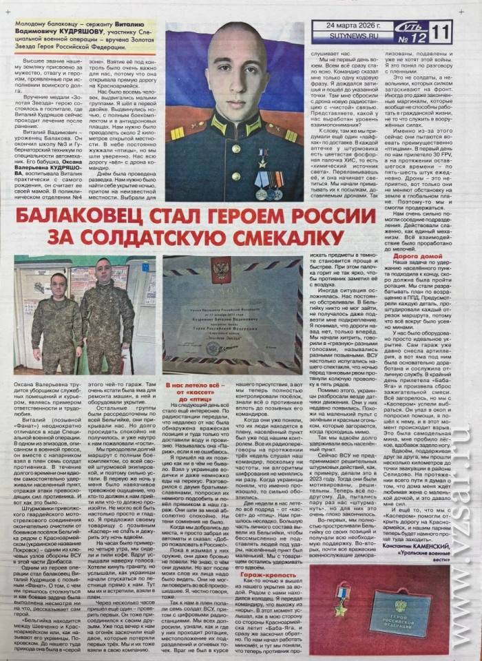 "Уроженец Балаково сержант Виталий Кудряшов с позывным "Фанат" удостоен высшей государственной награды. Указом Президента РФ от 12 декабря 2025 года за мужество, отвагу и героизм, проявленные при исполнении воинского долга, военнослужащему присвоено звание Героя Российской Федерации. Торжественное вручение медали "Золотая Звезда" состоялось в госпитале Донецка", - рассказала в конце декабря "Газета Балаково".
