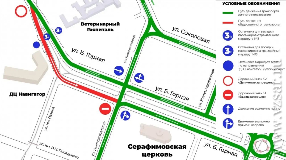 На участке от ДЦ "Навигатор" до улицы Танкистов организовано двустороннее движение по четной стороне улицы. По нечетной стороне – от "Навигатора" до Университетской – проезд разрешен только для общественного транспорта и для тех, кто проживает или работает на данном участке.