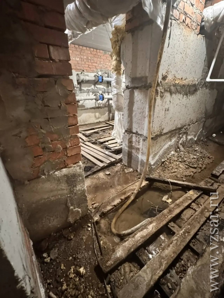 Они прислали в подтверждение своих слов фотографии и видео, снятые в подвале. На кадрах видно, что в помещении местами стоит вода, а из одной трубы она прямо-таки бьет фонтаном.