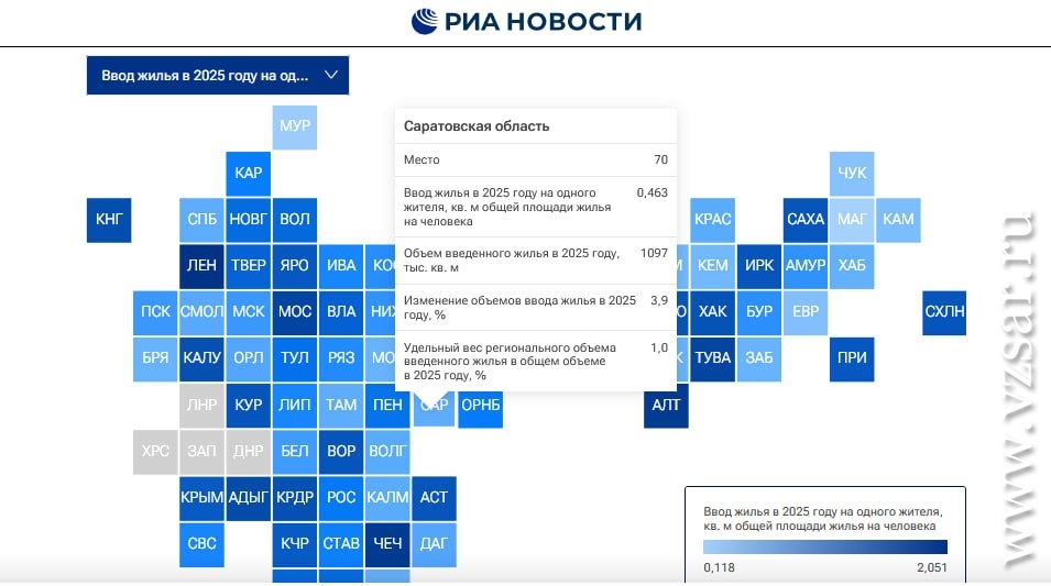 Саратовская область оказалась по итогам прошлого года на 70-м месте, поднявшись, по сравнению с результатами 2024-го, на три позиции. Объем введенного жилья у нас составил 1 млн 97 тыс. кв. метров (+3,9%), что составляет 0,46 кв. метра на одного жителя.