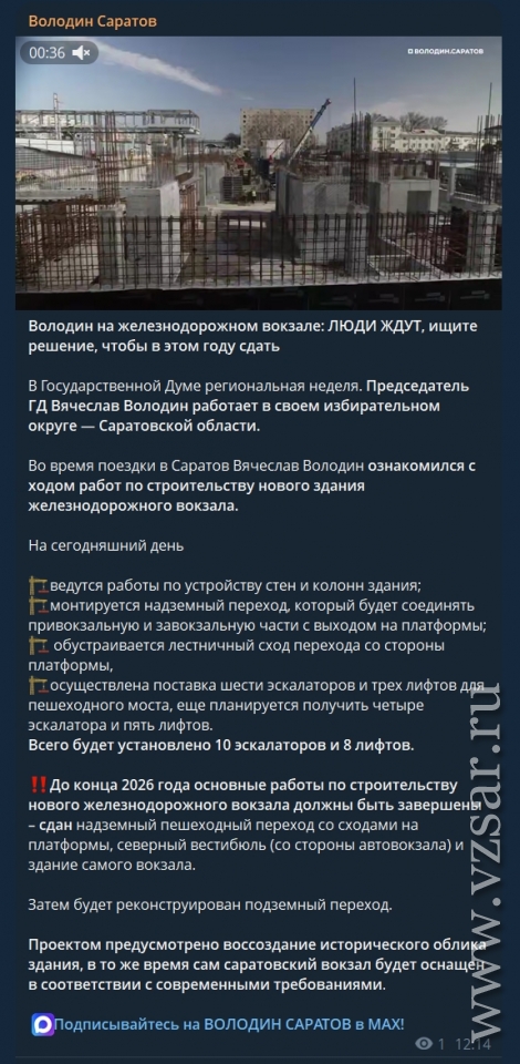 "Сейчас ведутся работы по устройству стен и колонн здания; монтируется надземный переход, который будет соединять привокзальную и завокзальную части с выходом на платформы; обустраивается лестничный сход перехода со стороны платформы; осуществлена поставка шести эскалаторов и трех лифтов для пешеходного моста, еще планируется получить четыре эскалатора и пять лифтов", - говорится в сообщении сторонников Володина.