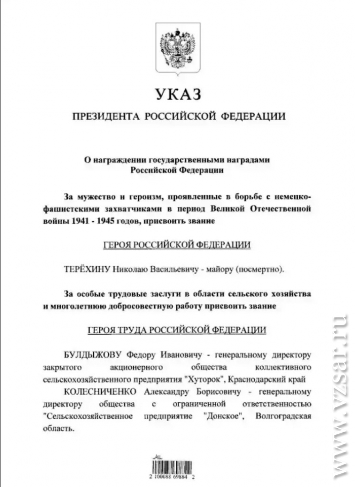 Вчера президент Владимир Путин подписал указ о присвоении (посмертно) звания Героя России уроженцу Саратовской губернии Николаю Терехину.