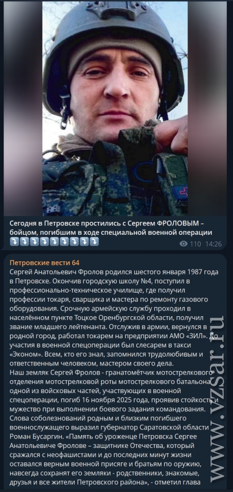 Издание "Петровские вести 64" рассказало, что сегодня в городе простились с погибшим Сергеем Фроловым.
