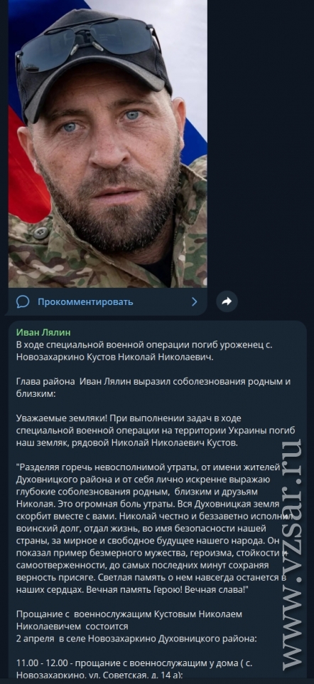 Глава Духовницкого района Иван Лялин рассказал, что завтра в селе Новозахаркино пройдет прощание с погибшим Николаем Кустовым.