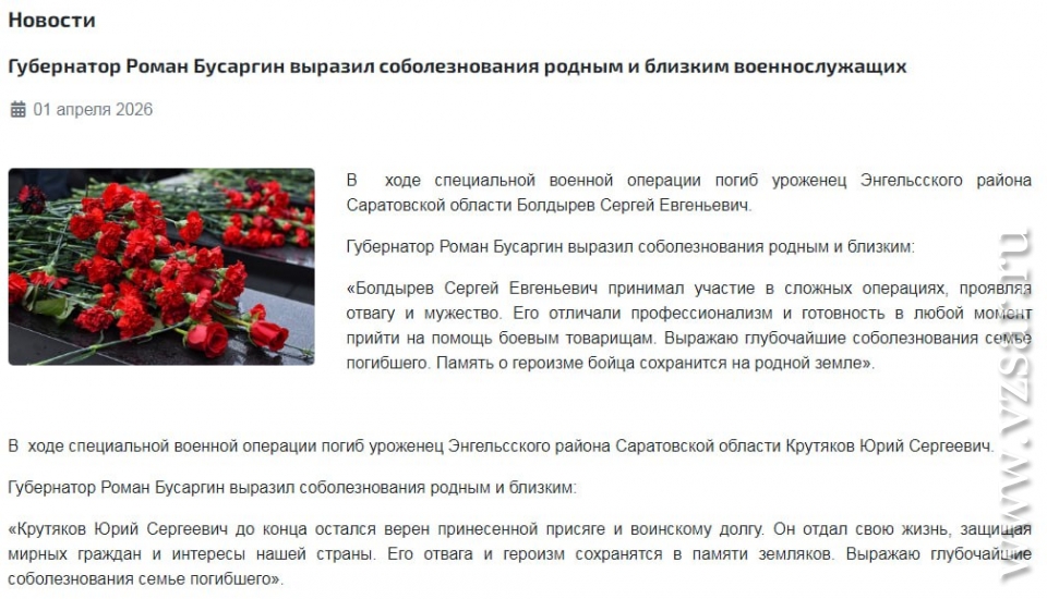 Администрация Энгельсского района без подробностей сообщила о гибели Сергея Болдырева и Юрия Крутякова.