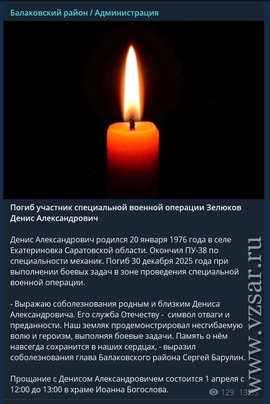 Администрация Балаковского района рассказала, что сегодня пройдет прощание с погибшим Денисом Зелюковым.