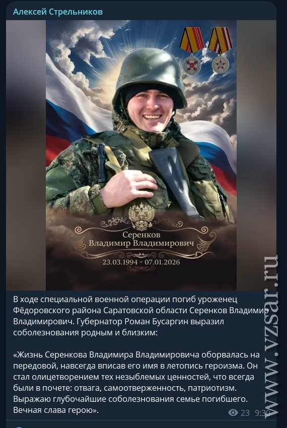 Глава Федоровского района Алексей Стрельников сообщил о гибели Владимира Серенкова.