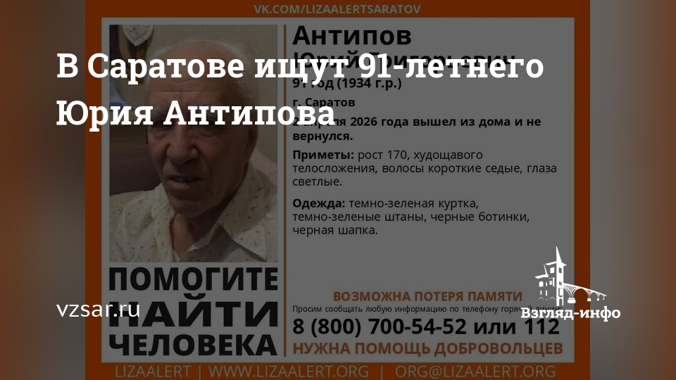 В Саратове ищут без вести пропавшего 91-летнего Юрия Антипова. Об этом сообщает поисковый отряд "Лиза Алерт Саратов".