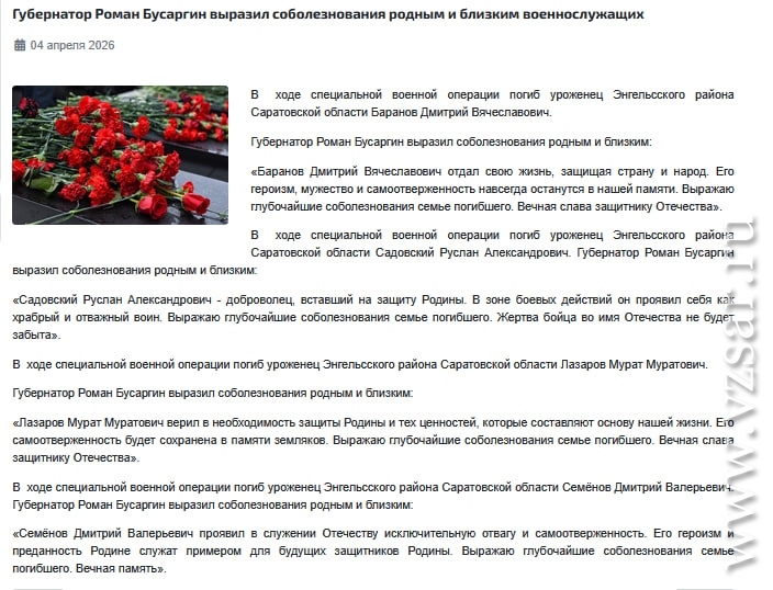 Администрация Энгельсского района без подробностей сообщила о гибели Дмитрия Баранова, Руслана Садовского, Мурата Лазарова и Дмитрия Семенова.