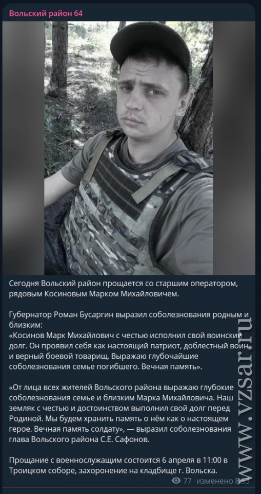 Администрация Вольского района рассказала, что сегодня в городе прошло прощание со старшим оператором, рядовым Марком Косиновым.