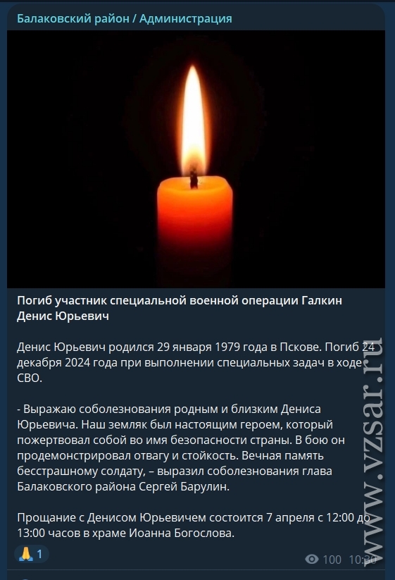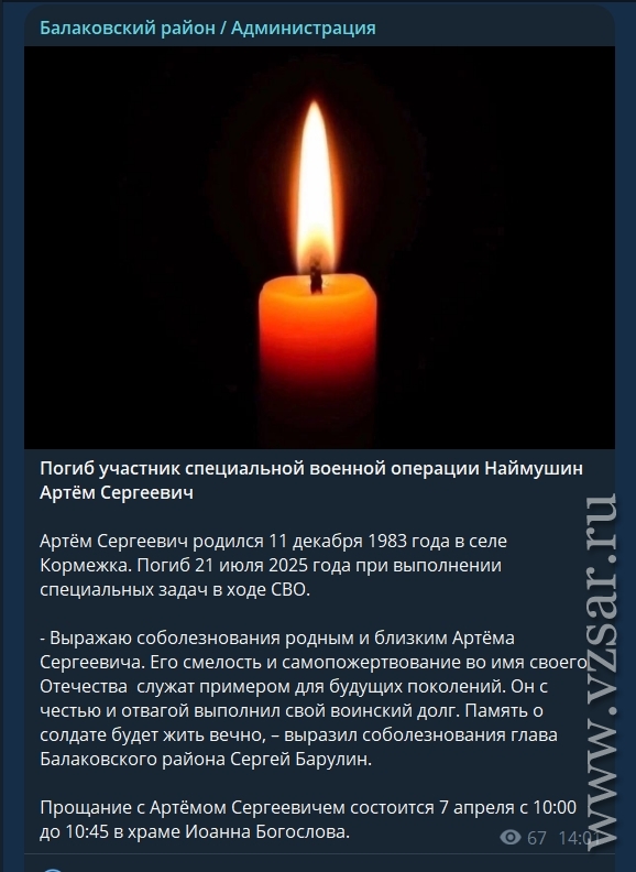 Также администрация Балаковского района рассказала, что завтра пройдет прощание с погибшими Артемом Наймушиным и Денисом Галкиным.