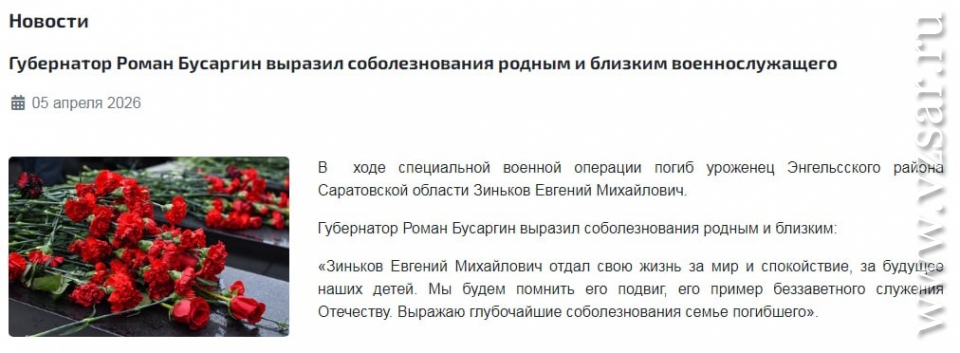 Администрация Энгельсского района без подробностей сообщила о гибели Евгения Зинькова.
