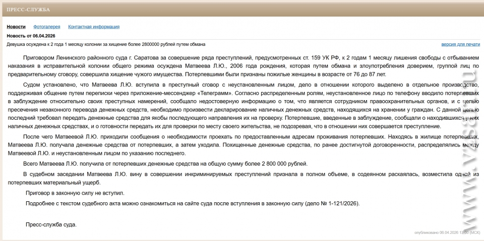 Ленинский райсуд Саратова вынес обвинительный приговор 19-летней Лиане Матвеевой. Ей инкриминировались четыре эпизода мошенничества, сообщается на сайте судебной инстанции.