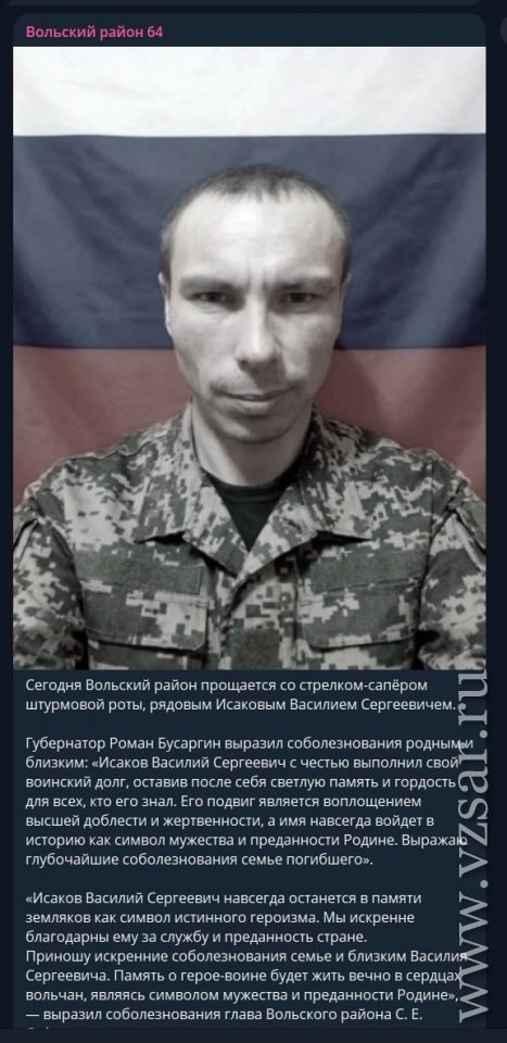 Администрация Вольского района рассказала, что сегодня в селе Тепловка прошло прощание со стрелком-сапером штурмовой роты, рядовым Василием Исаковым.