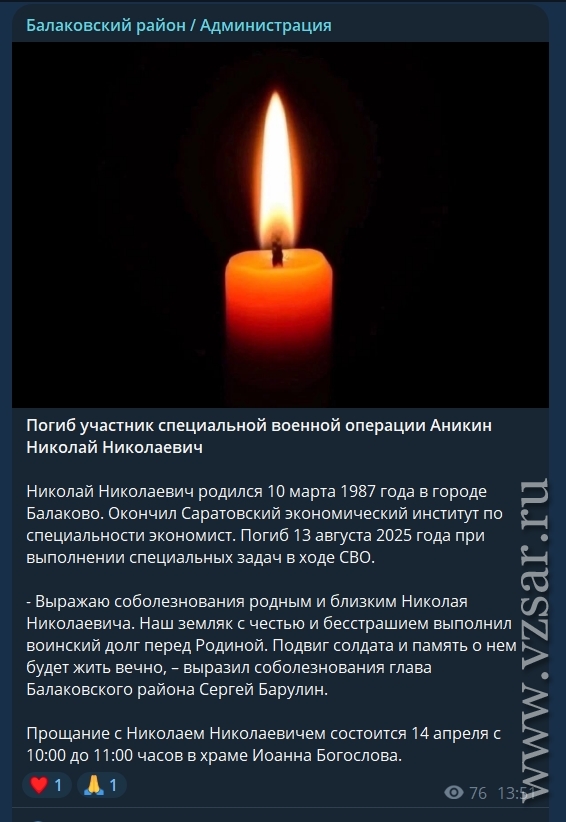 Также администрация Балаковского района рассказала, что во вторник, 14 апреля, пройдет прощание с погибшим Николаем Аникиным.