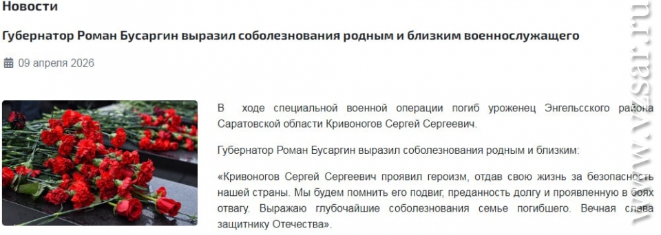 Администрация Энгельсского района без подробностей сообщила о гибели Сергея Кривоногова.
