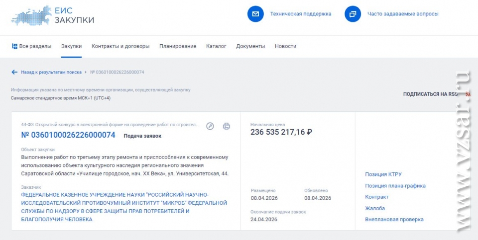 Расположенный в Саратове Российский противочумный институт "Микроб" (подведомственен Роспотребнадзору) объявил конкурс на третий этап восстановления здания бывшей школы № 99 на улице Университетской, 44.