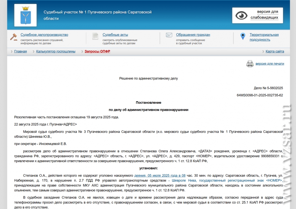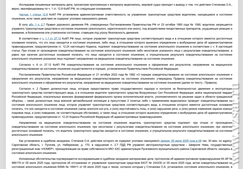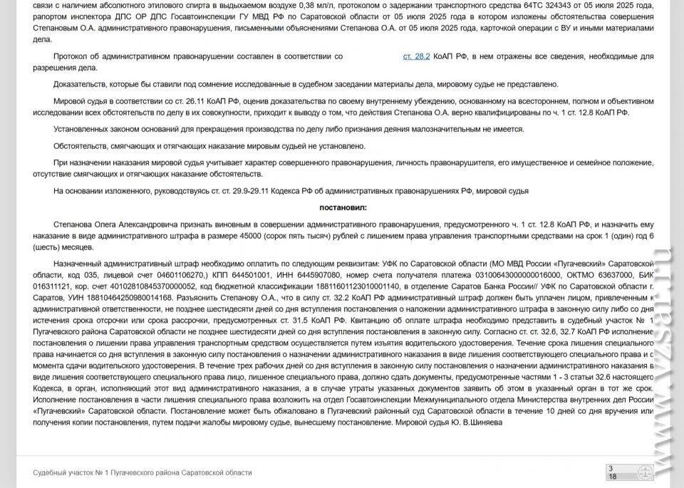 Согласно сведениям из базы данных решений мировых судов, 5 июля прошлого года в 8.30 в Пугачеве сотрудники ГАИ уже останавливали пьяного Олега Степанова. Тогда он управлял машиной аналогичной модели (авто было собственностью МКУ "Административно-хозяйственная служба администрации Пугачевского муниципального района"). На него был составлен административный протокол по ч. 1 ст. 12.8 КоАП РФ.