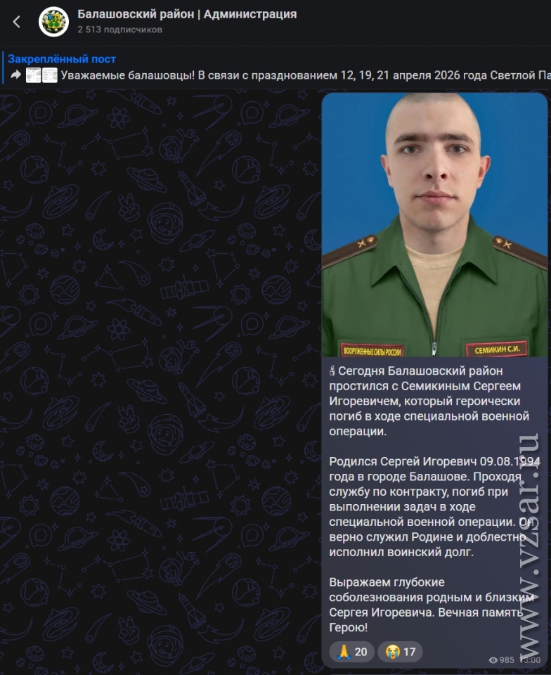 Администрация Балашовского района сообщает о гибели Сергея Семикина. Он родился 9 августа 1994 года. Проходил службу по контракту.