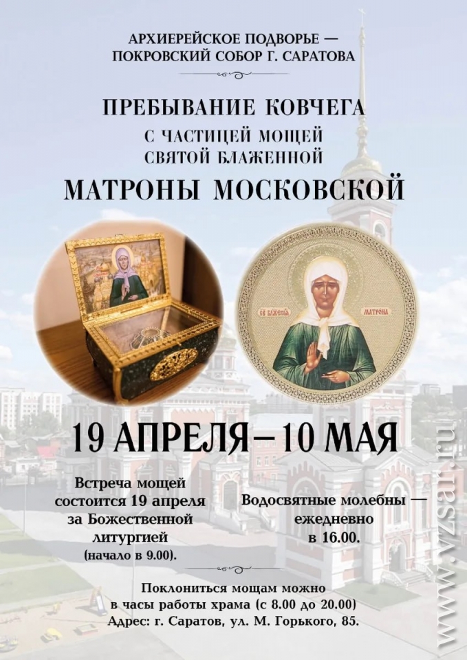 С воскресенья, 19 апреля, в Покровском соборе Саратова (ул. Горького, 85) можно будет помолиться у ковчега с частицей мощей святой блаженной Матроны Московской.