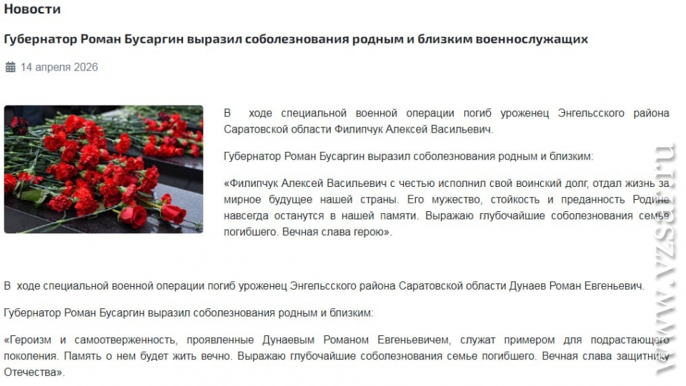 Администрация Энгельсского района без подробностей сообщила о гибели Алексея Филипчука и Романа Дунаева.