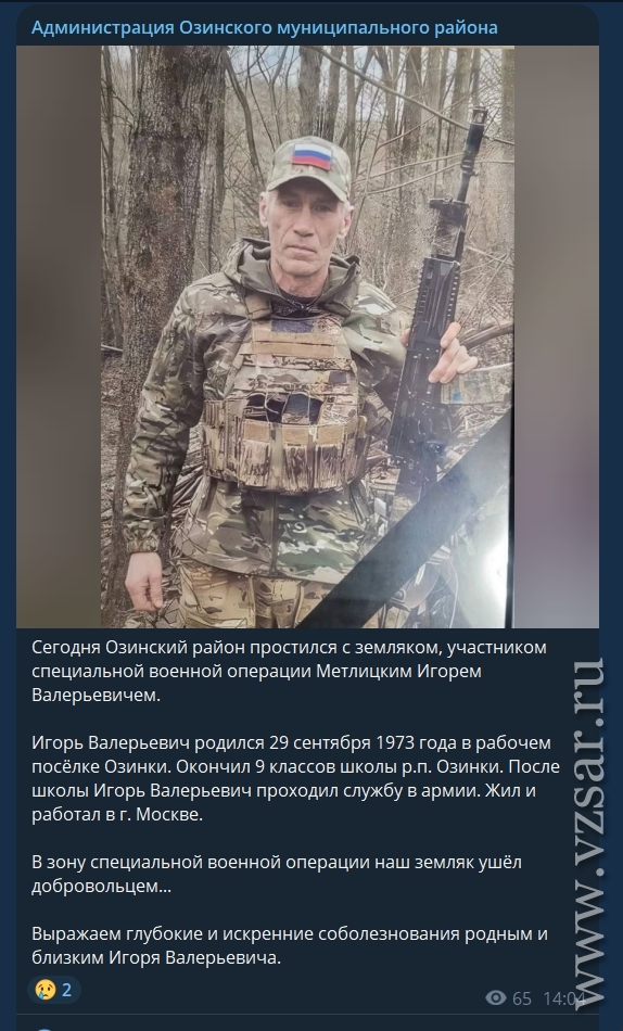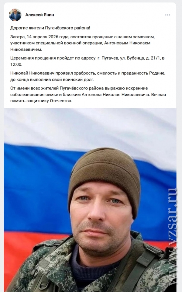 Глава Пугачевского района Алексей Янин рассказал, что сегодня в райцентре простились с Николаем Антоновым, а администрация Озинского района поведала о проводах в последний путь Игоря Метлицкого, который родился в райцентре 29 сентября 1973 года, в последнее время жил и работал в Москве, а в зону СВО ушел добровольцем.