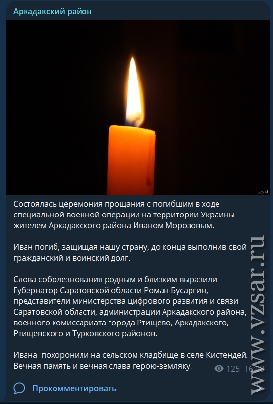 Администрация Аркадакского района рассказала о прошедшем вчера в селе Кистендей прощании с Иваном Морозовым.