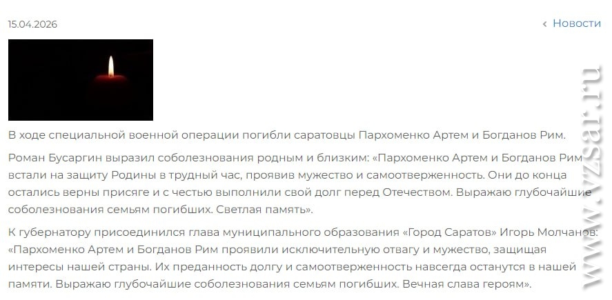 Администрация Саратова без подробностей сообщила о гибели Артема Пархоменко и Рима Богданова.