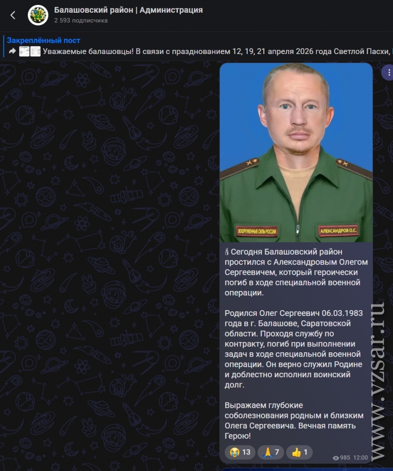 Администрация Балашовского района рассказала, что сегодня прошло прощание с Олегом Александровым.