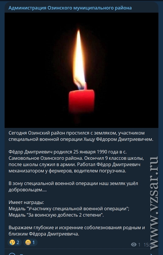 Также администрация Озинского района рассказала о прошедшем сегодня прощании с погибшим Федором Хыцу.