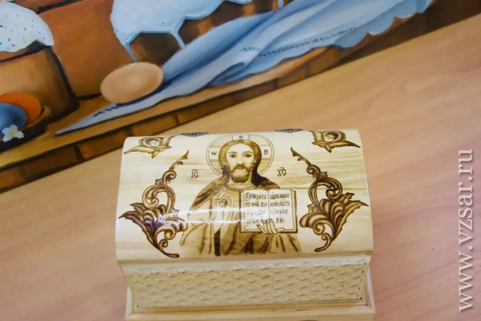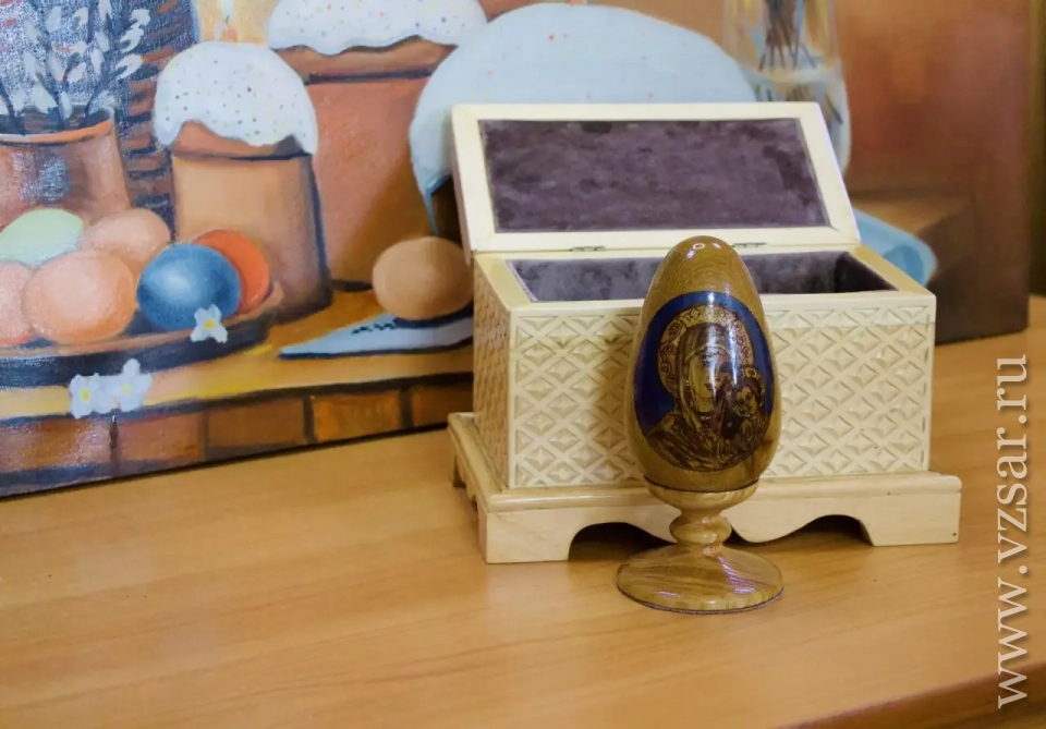 Резную шкатулку из дерева, украшенную с использованием техники пирографии, изготовил участник, отбывающий наказание в ИК-33 (Саратов). На изготовление пасхального сувенира, занявшего третье место, 49-летнему осужденному из Базарного Карабулака потребовалось две недели.