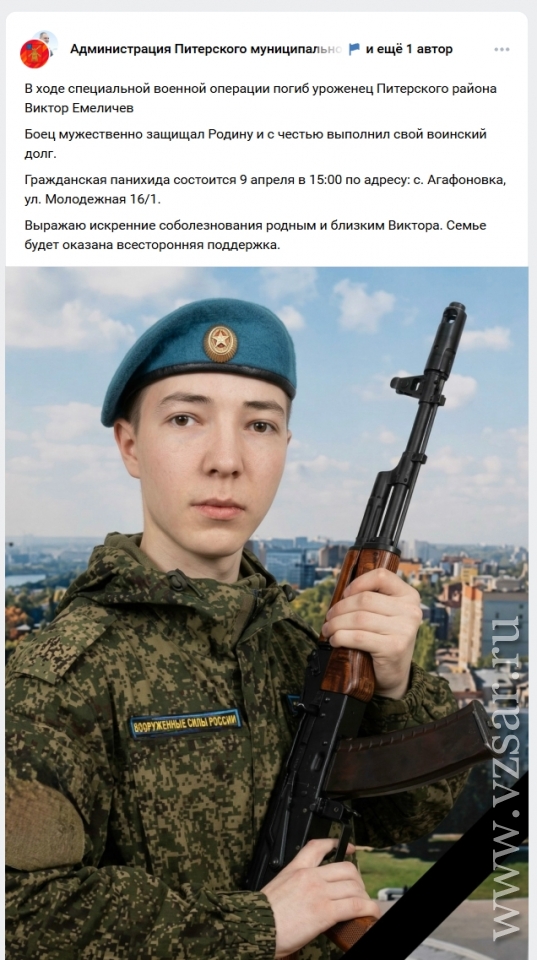 Администрация Питерского района рассказала, что в селе Агафоновка простились с Виктором Емеличевым.