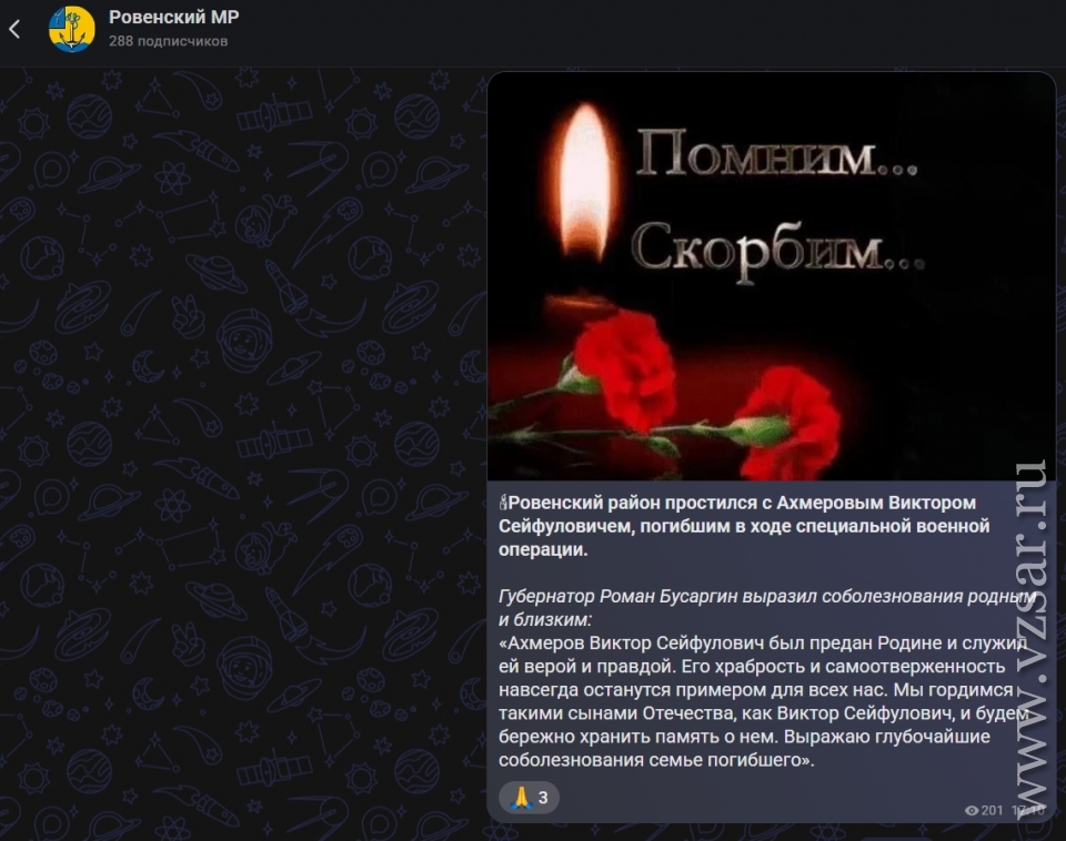 Также администрация Ровенского района сообщила о прошедшем вчера прощании с Виктором Ахмеровым.