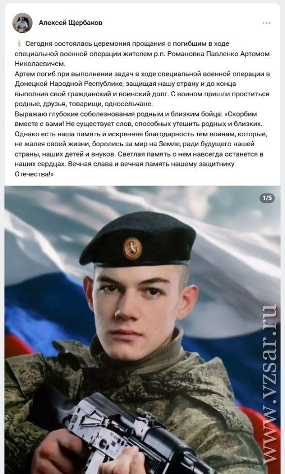 Глава Романовского района Алексей Щербаков рассказал о прошедших прощаниях с жителями райцентра Артемом Павленко и села Мордовский Карай Виталием Костиковым.