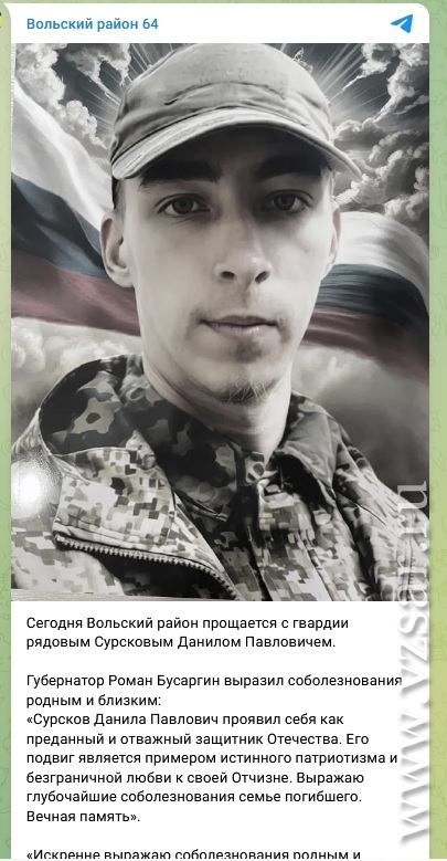О прощании с Данилом Сурсковым рассказала администрация Вольского района. Прощание с ним состоялось сегодня в Троицком соборе райцентра, а захоронение - на кладбище Вольска.