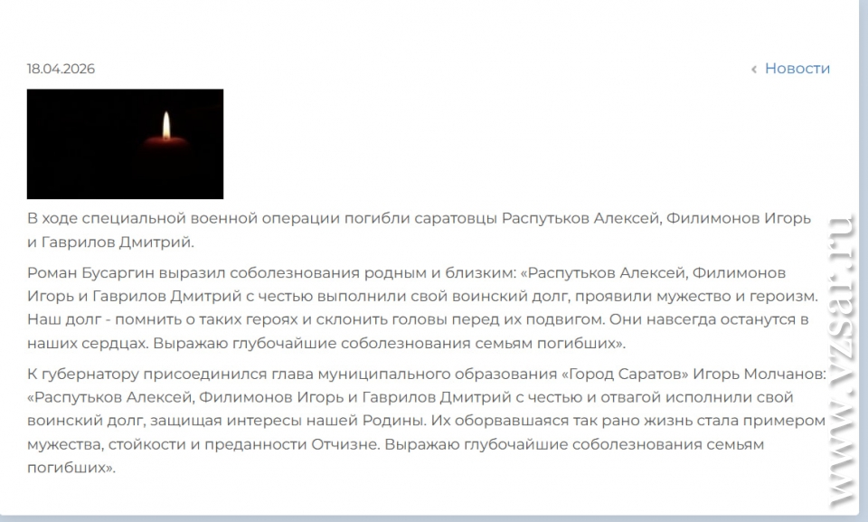 Адмнистрация Саратова сообщила о погибших Алексее Распутькове, Игоре Филимонове и Дмитрии Гаврилове.
