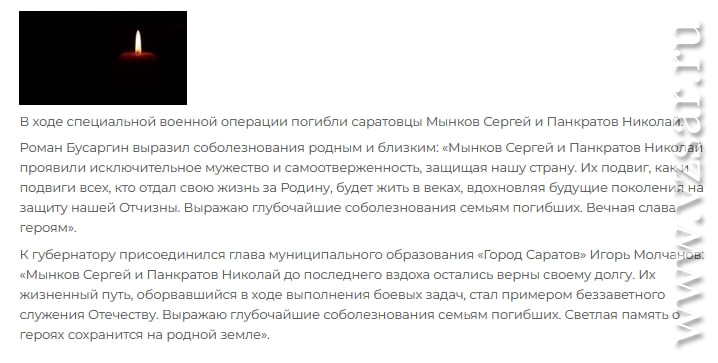 Администрация Саратова без подробностей проинформировала о погибших Сергее Мынкове и Николае Панкратове.